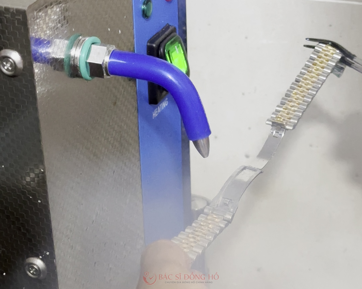 Dây vỏ được sục rửa sạch sẽ bằng máy siêu âm và thổi hơi nước áp suất cao để loại bỏ thuốc đánh bóng, cặn bẩn bám. Cuối cùng sẽ được sấy khô hoàn toàn trước khi ráp vỏ.