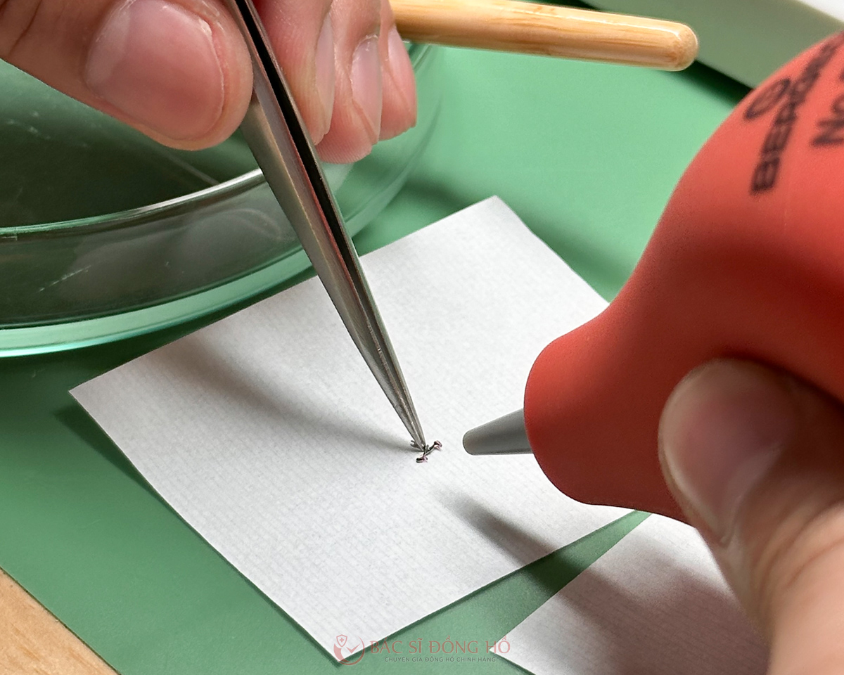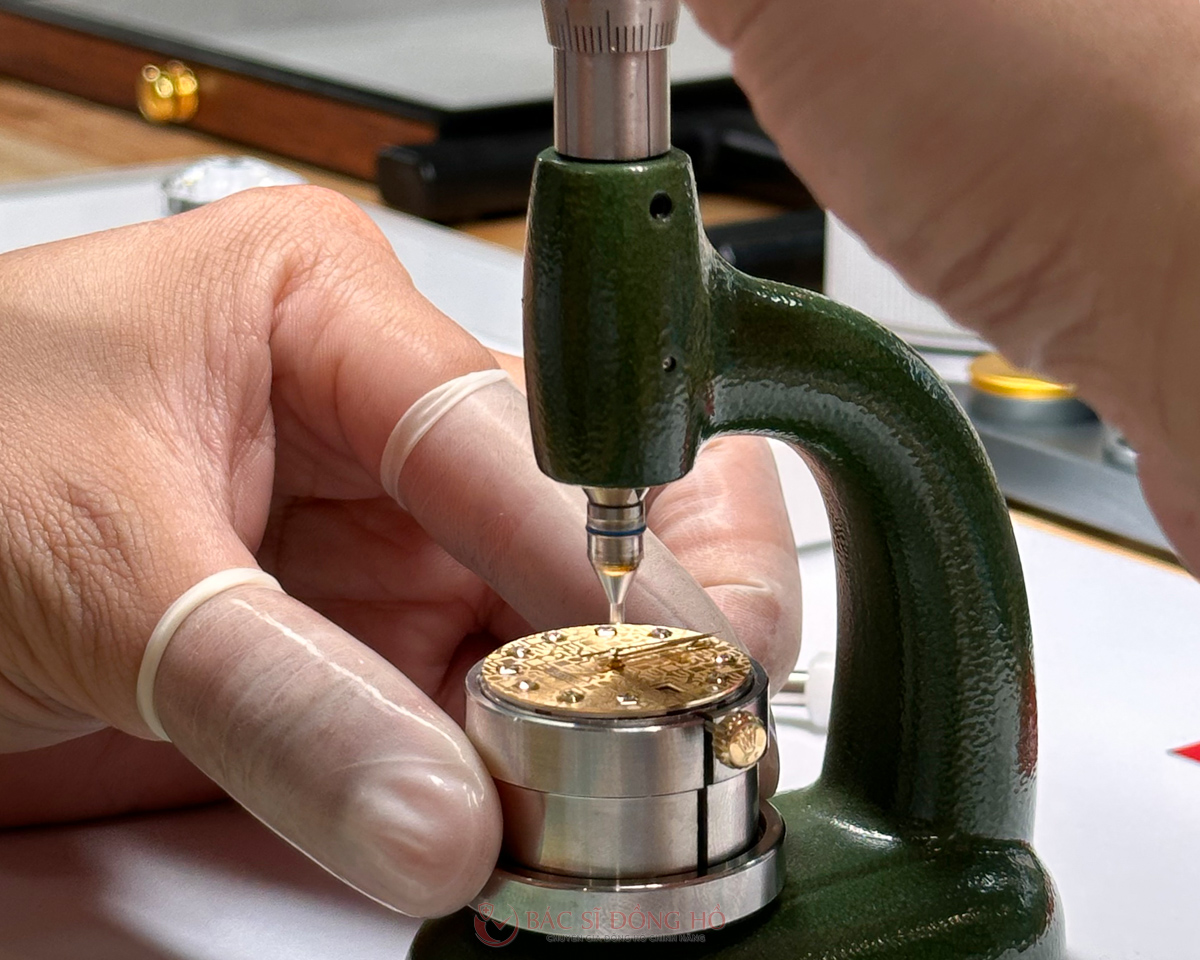Sau khi làm sạch, các chi tiết máy được lắp ráp theo trình tự tiêu chuẩn hãng, chấm dầu mới tại chân kính, đầu trục, hộp cót, các điểm tiếp xúc linh kiện với 8 loại dầu khác nhau theo quy chuẩn Thụy Sĩ, đảm bảo hiệu năng ổn định và bền bỉ.