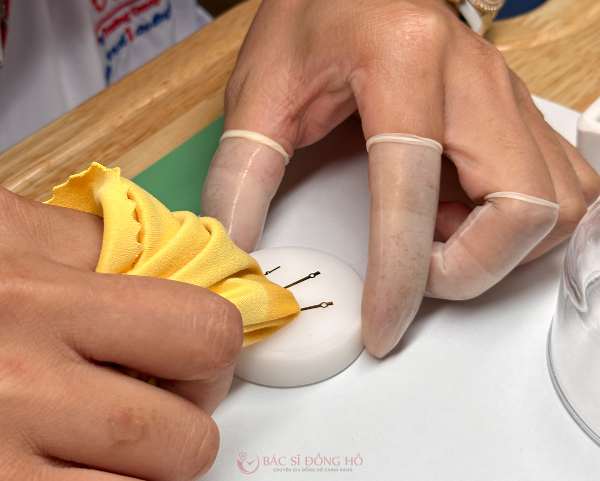 Các kim, mặt số được vệ sinh cẩn thận loại bỏ vết ố, mốc. Sau đó kim được đặt đảm bảo đúng tiêu chuẩn kĩ thuật.