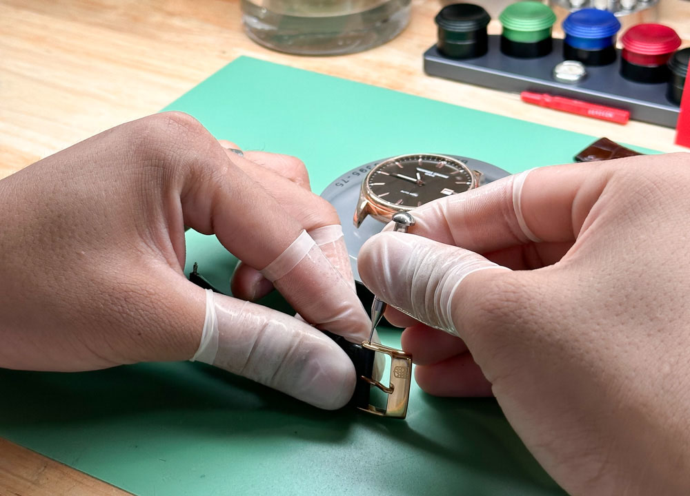 Tiến hành thay dây mới đảm bảo không xước vỏ đồng hồ và đúng chiều dây.