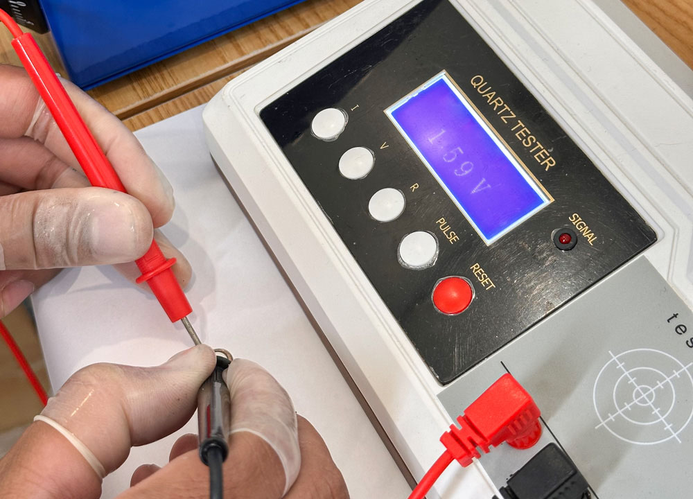 Kiểm tra IC và Pin đồng hồ bằng máy đo chuyên dụng để đánh giá tình trạng hoạt động của máy.